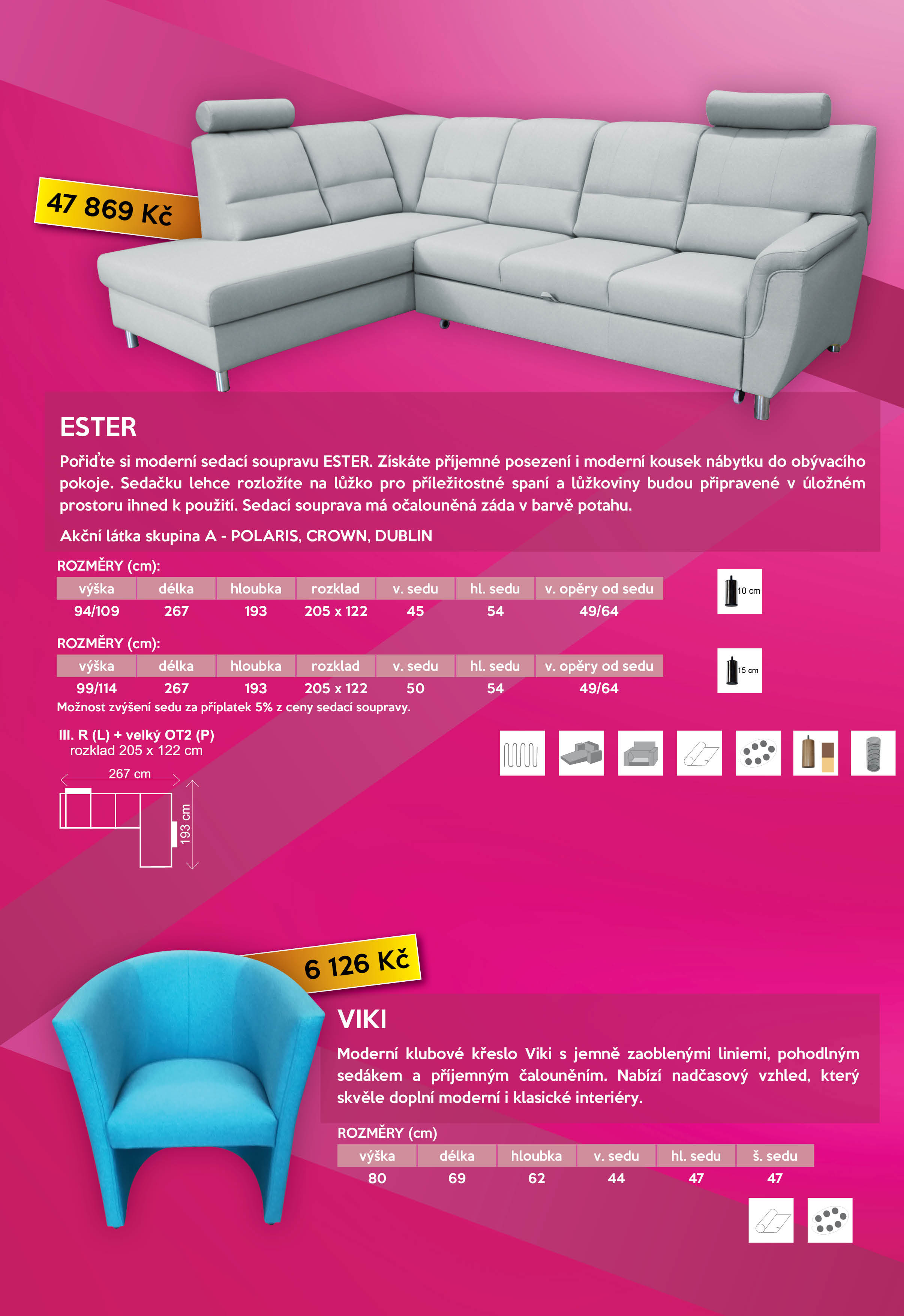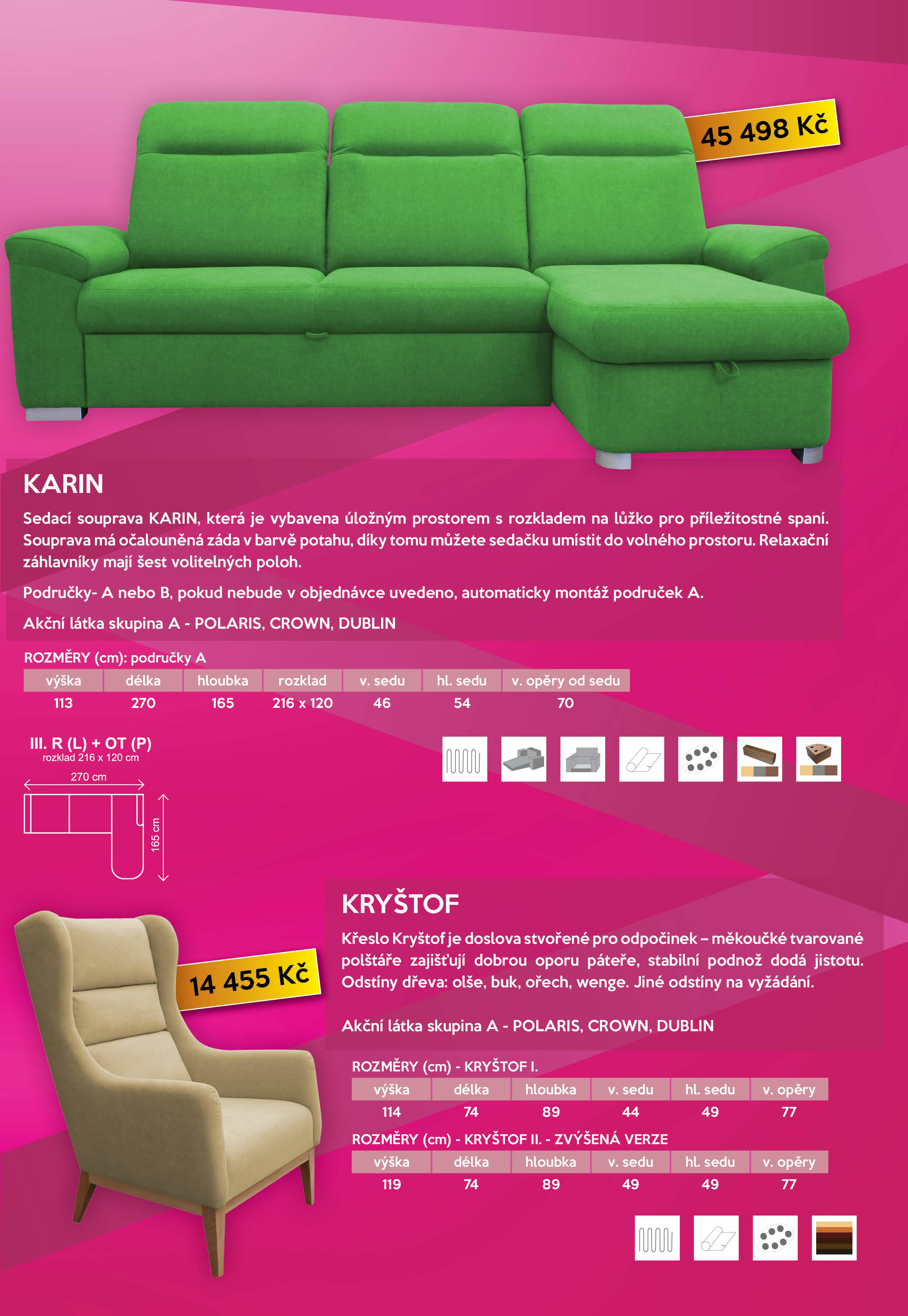 U nás na prodejně máme z této akční nabídky k vyžkoušení vystavené modely ESTER, KARIN a křeslo KRYŠTOF.