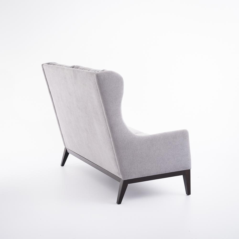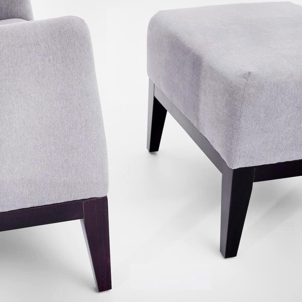 Skladá se z 2 částí: čalouněná sedací část a dřevěná podnož mořená/barvená.