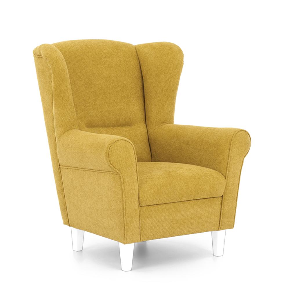 Křeslo s dřevěnými nohami mořenými nebo lakovanými.