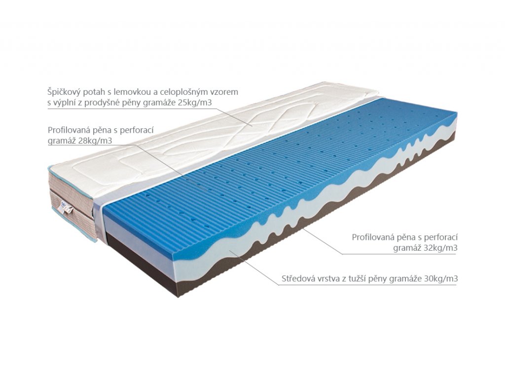 Pětizónová matrace z tvarovaných polyuretanových pěn nabízí příjemné pohodlí a vyváženou oporu.