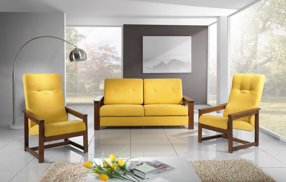 Sedací souprava s masivním bukovým bokem. Pohovku popř. jednosed lze vyrobit v rozkládací nebo pevné variantě v šíři sedáku 80 nebo 90 cm.U pohovky lze rozložit každé lůžko zvlášť
